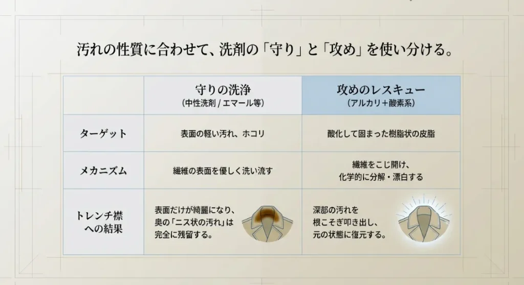 しかし、トレンチの襟汚れの正体は、体温で温められ、空気に触れてカチカチに固まった「酸化した脂」です。中性洗剤の穏やかな力では、この頑固な脂のバリアを突破することができません。汚れを落とすためのエネルギーが根本的に不足しているのです。