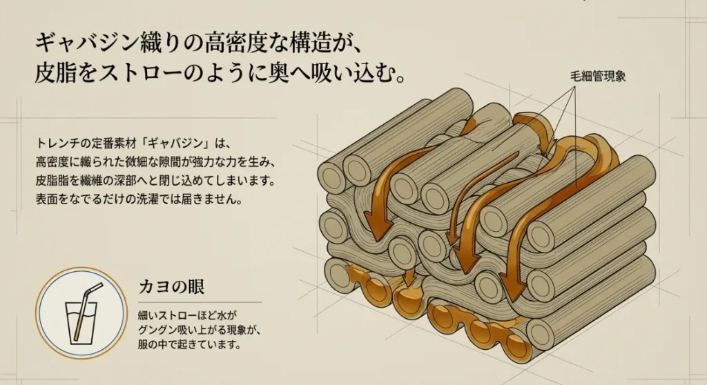 トレンチコートの定番素材「ギャバジン」は、雨や風を通さないために糸をギリギリまで密に編み込んでいます。この密度の高さがトレンチの魅力ですが、洗濯においてはこれが「迷宮」になってしまいます。