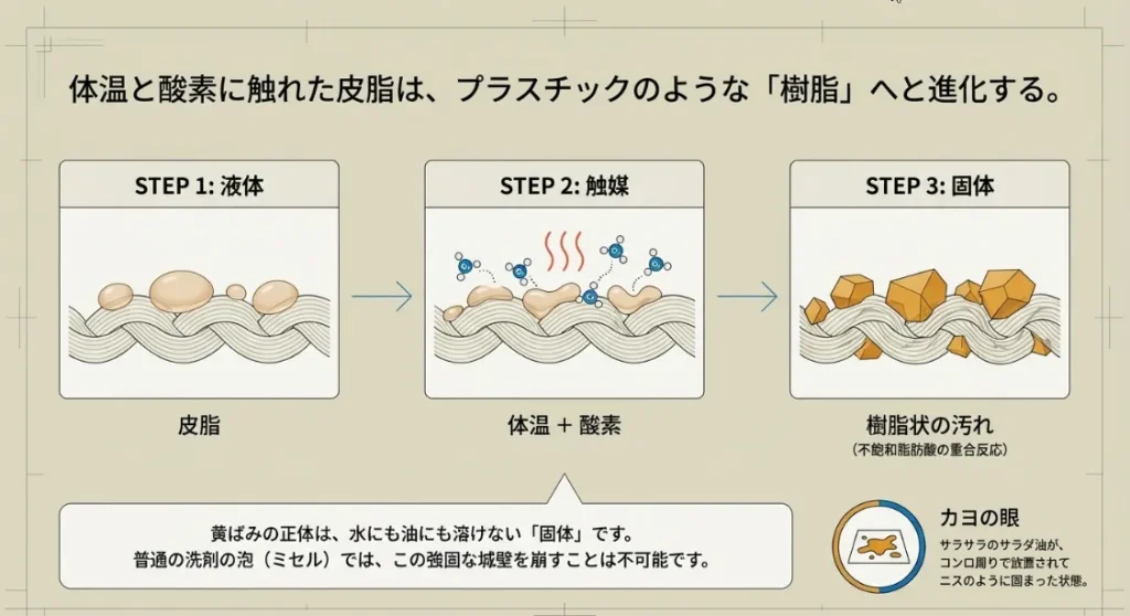 酸化が進んだ皮脂は、粘り気を増し、最終的にはプラスチックのようにカチカチに固まる「樹脂化」という状態になります。キッチン周りのベタベタ汚れが、掃除をサボると簡単には落ちなくなるのと同じ現象です。ここまでくると、汚れはもはや「液体」ではなく「固形物」として繊維にこびりついています。