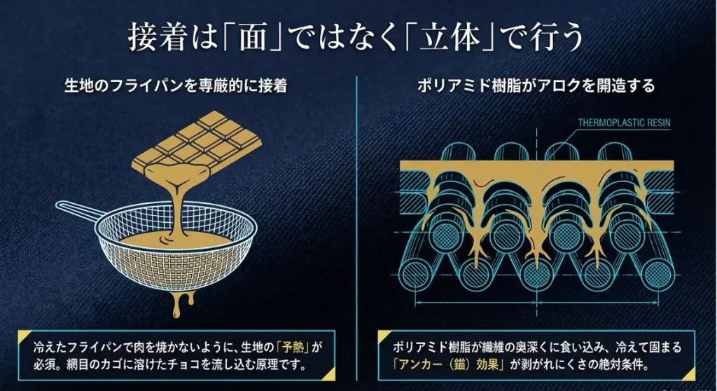 圧力をかけながら一気に冷やすことで、糊が繊維を掴んだまま「結晶化」し、洗濯機の激しい揺れにも耐えうる強固な結合が生まれます。