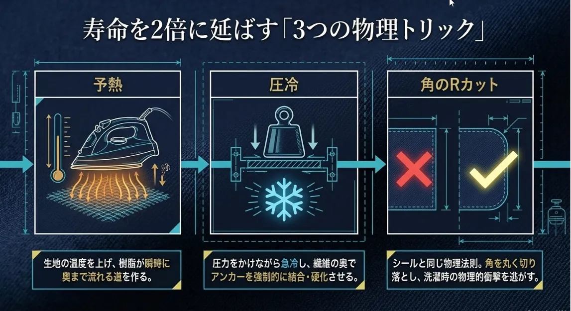 せっかく直したのに、1回の洗濯でペロッと剥がれてしまうのは悲しいですよね。糊のポテンシャルを最大化し、剥離(はくり)応力という物理的な力に打ち勝つための3つのテクニックを紹介します。