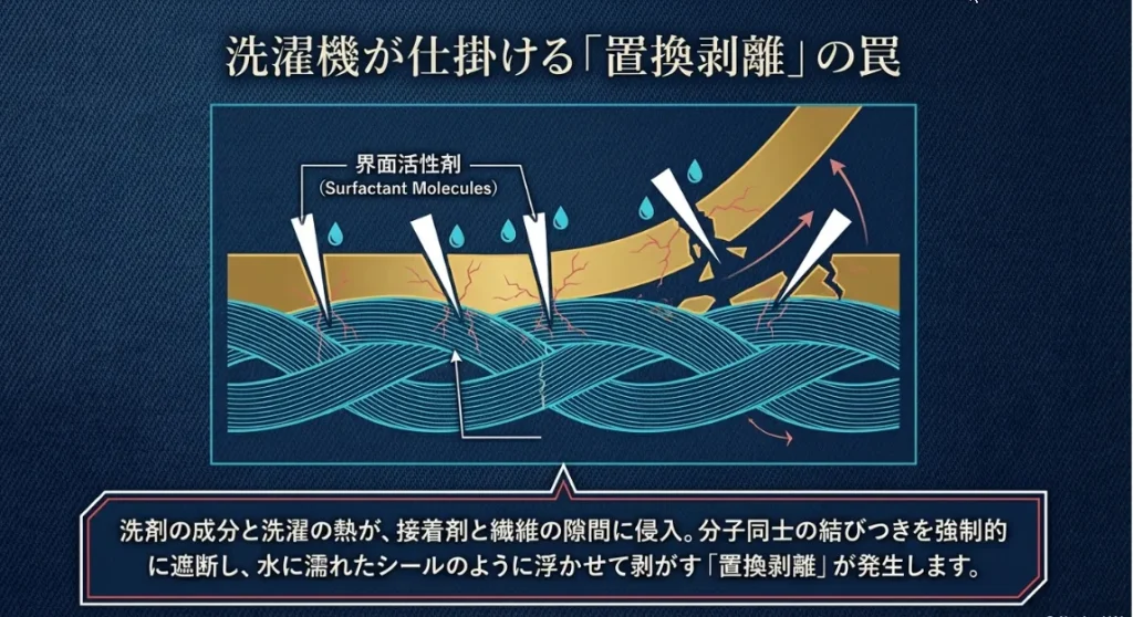 洗濯洗剤は、衣類の繊維にこびりついた皮脂や泥を「浮かせて引き剥がす」のがお仕事です。でも、洗剤の成分は「汚れ」と「補修布の接着剤」を区別してくれません。糊と繊維のわずかな隙間に洗剤がスルスルと入り込み、まるでシールを水に濡らして剥がすように、接着剤の力を弱めてしまうんです。