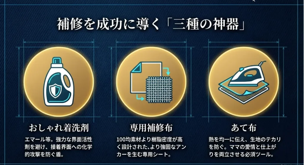 補修を成功させ、大切な一着を長持ちさせるための三種の神器をまとめました。100均グッズを卒業したい方、より確実に直したい方はチェックしてみてくださいね。
