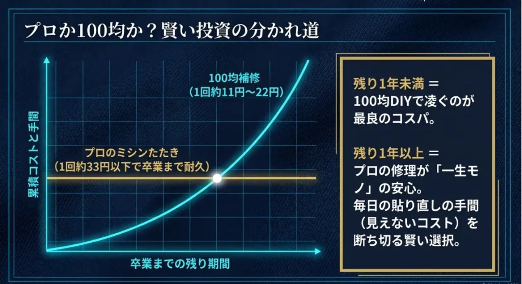 「110円で直せるなら100均が一番!」と思いがちですが、実は「その補修が何回洗濯に耐えられるか」という視点で見ると、意外な結果が見えてきます。100均の補修とプロの技術、それぞれのコストパフォーマンスを比較表にまとめました。