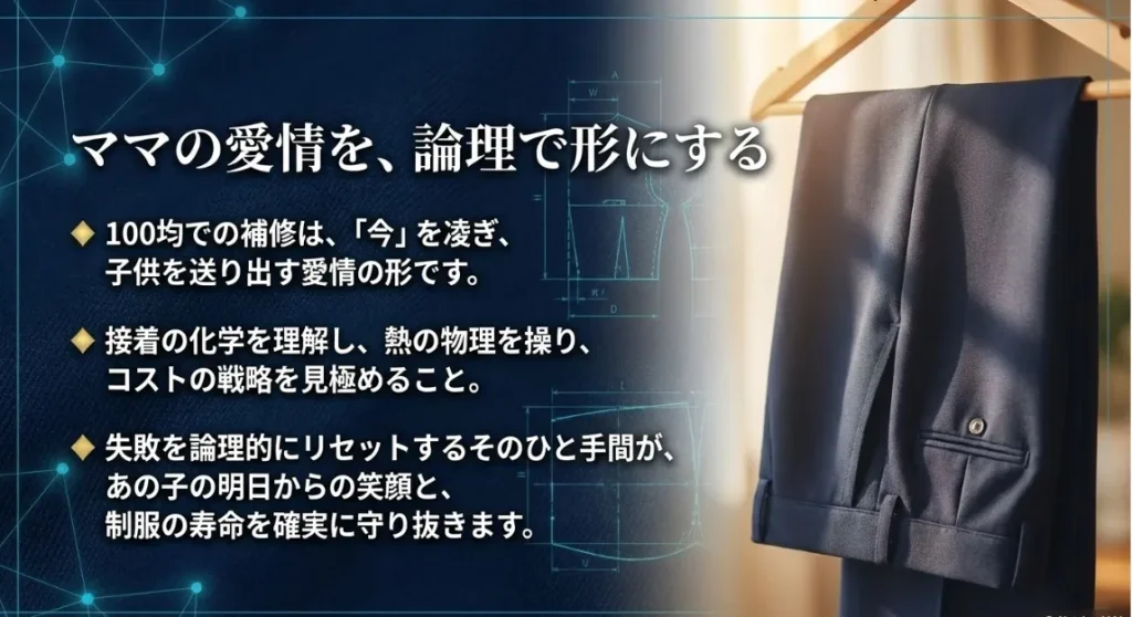 もし、ご自身で補修してみて「どうしても上手くいかない」「生地が厚すぎてくっつかない」と感じたら、それは決してあなたの技術不足ではありません。高密度な制服の生地は、家庭用アイロンの重さ(約3kg程度)では糊を奥まで押し込みにくいという物理的な限界があるんです。そんな時は、無理せずプロの「ミシンたたき」や「かけつぎ」という選択肢を頼ってください。