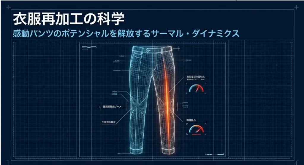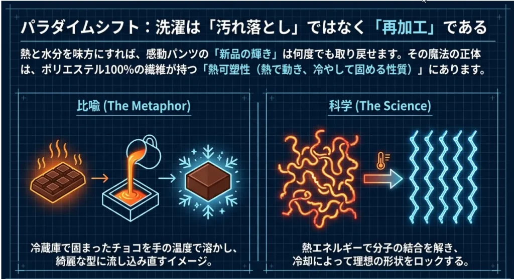 感動パンツの魅力といえば、あのビシッと一本通ったセンタープレスですよね。でも、アイロンをかけてもすぐ消えてしまったり、逆に「テカリ」が出てしまったり……。これ、実は温度のコントロールがすべてなんです。ポリエステル100%の感動パンツは、熱を加えると形を変え、冷めるとその形を記憶する「熱可塑性(ねつかそせい)」という性質を持っています。