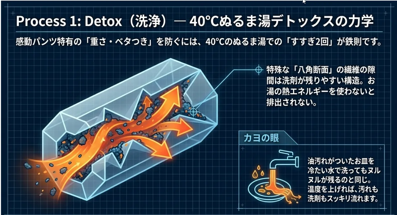 感動パンツを洗った後、なんだか「生地が重い」「ベタつく」と感じたことはありませんか? 実はこれ、感動パンツ特有の「高密度な織り」が原因なんです。このパンツに使われている特殊な繊維は、断面が八角形という複雑な形をしていて、そのおかげで速乾性を生んでいるのですが、同時に「洗剤の成分」を捕まえて離さないという困った一面も持っています。