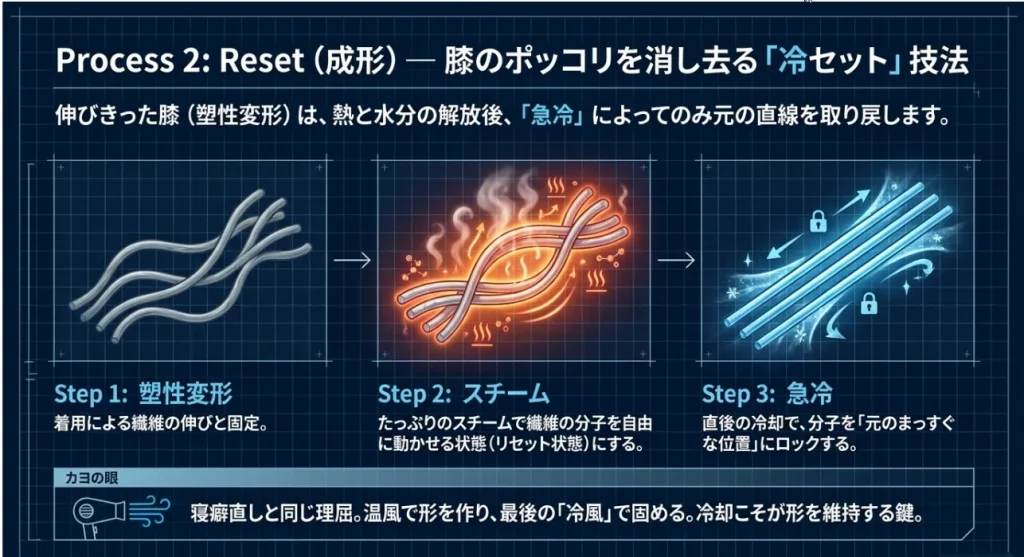 膝のポッコリを消す!スチームと急冷の「冷セット」技法