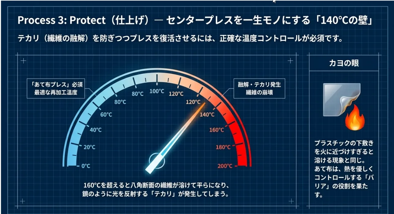 一度溶けてしまった繊維は元に戻せません。だからこそ、表面温度を140℃付近でピタリと止める「メッシュあて布」が必須なんです。あて布が熱のクッションになり、繊維の形を壊さずに中の分子だけを整えてくれますよ。