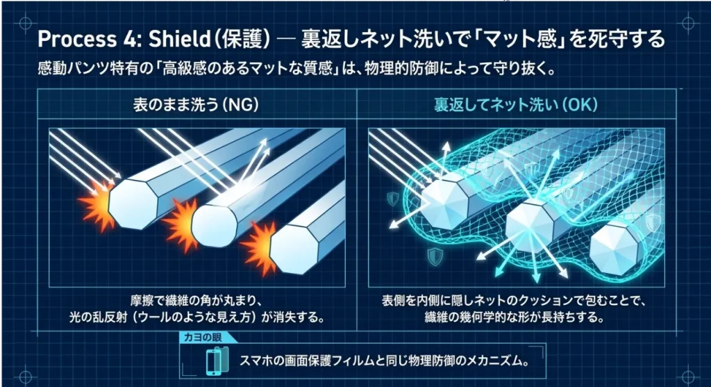 この美しい光の乱反射を一生モノにするためには、「裏返し」と「ネット」の二重ガードが鉄則です。汚れが気になる表側を内側に隠し、さらにネットに入れることで、洗濯槽との激しい衝突から繊維の形を物理的に守ります。理系流に言えば、繊維の「幾何学的構造の保存」ですね。