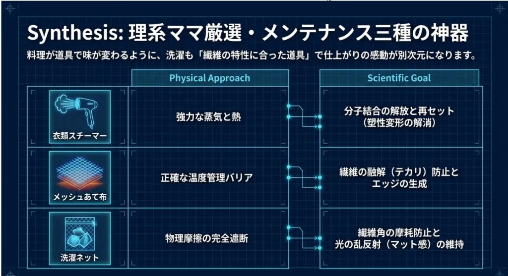 あわせて読みたい:アイロンなし!トレンチコートのしわ取り術|湿気と重力で直す理系ママの法則