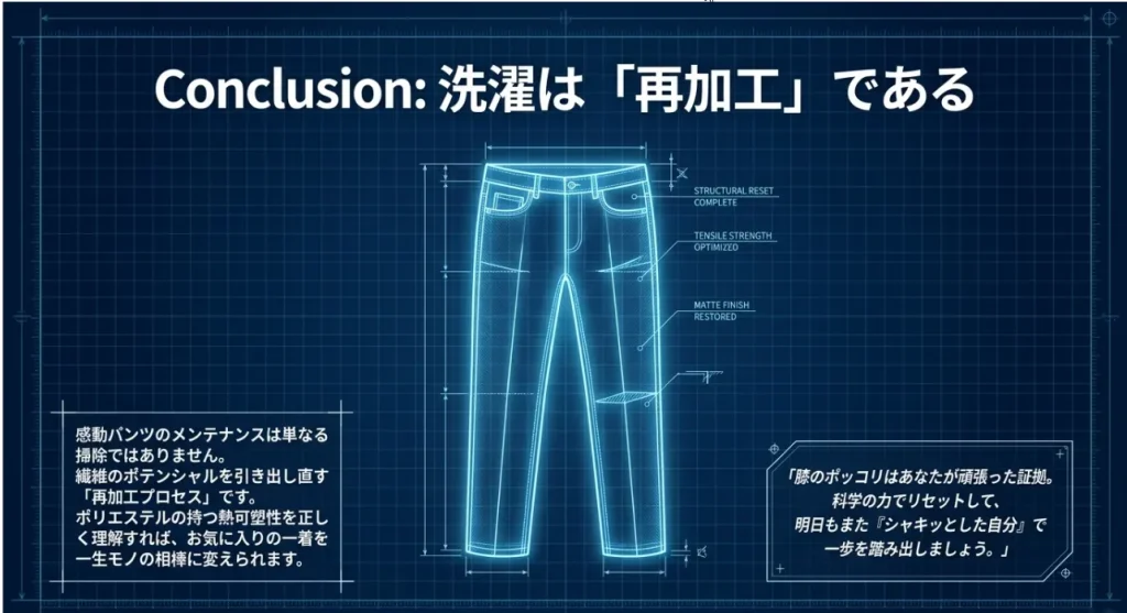 膝抜けが出てきたり、ラインが薄くなったりするのは、あなたが一生懸命歩き、働いた証拠。その力学負荷でバラバラになった分子の鎖を、熱と水分というエネルギーで優しく元の場所へ戻してあげる。そうすることで、ポリエステル100%のこの一着は、何度でもあなたに「感動」を届けてくれます。