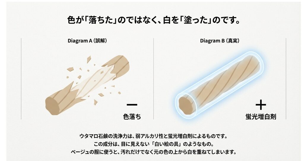 一つは「蛍光増白剤」。これは、紫外線を吸収して青白い光に変える染料の一種です。白物ワイシャツをより白く見せるには最高の成分ですが、生成りやベージュ、淡いパステルカラーに使うと、その部分だけが青白く発光し、色が抜けたように見えてしまうのです。もう一つは「弱アルカリ性(pH9〜10)」。石けん成分が高濃度(98%)で配合されているため、水に溶けると繊維が大きく膨らみます。この時、繊維の奥に定着していた染料まで一緒に流れ出してしまう「真の色落ち」が起きるのです。
