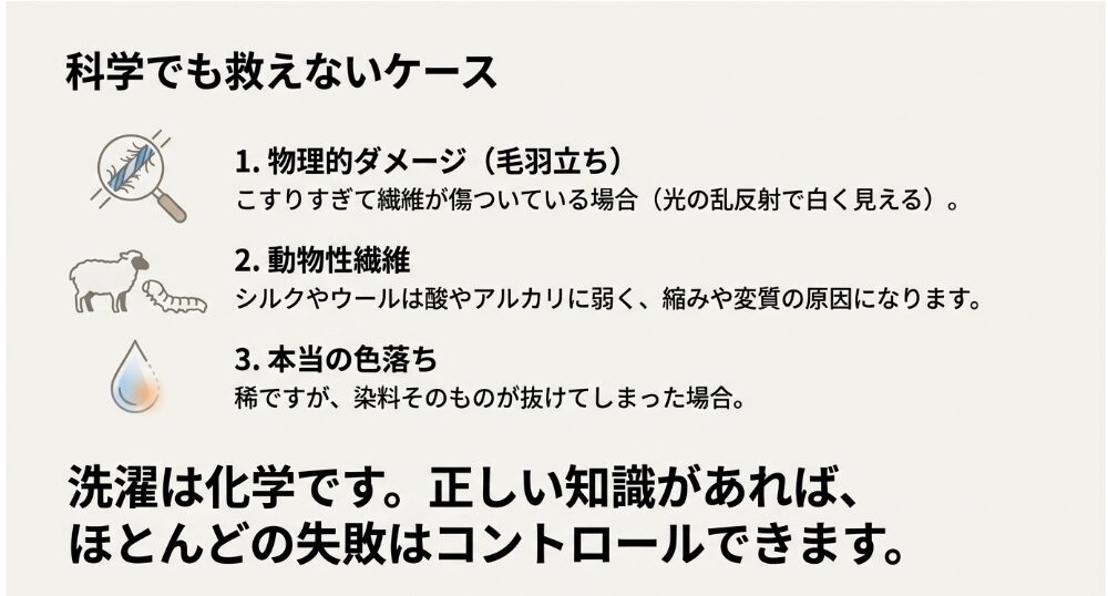 | 失敗のパターン | 原因となる成分/環境 | 繊維への影響 | 修復難易度 |