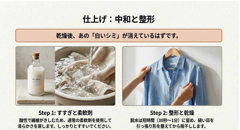 「明日の朝、どうしても着ていかなきゃいけないのに!」と、夜中に洗面所でパニックになっているあなたへ。専用のクエン酸やリセット剤が手元になくても、今すぐ被害を最小限に食い止めるためにできることがあります。一番の敵は「焦って乾燥させてしまうこと」です。