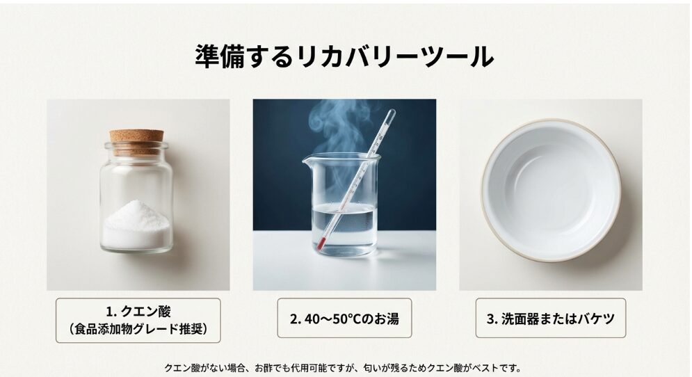 洗面器に、お風呂より少し熱いと感じる40度〜50度のぬるま湯を用意します。ここに、クエン酸を水1リットルに対して小さじ1杯の割合で溶かしてください。この「弱酸性」の環境が、アルカリで膨らんだ繊維を引き締め、付着した蛍光増白剤を剥がれやすくしてくれます。