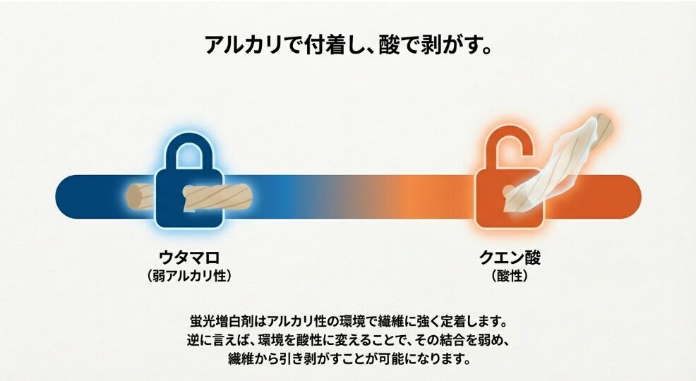 そして、すでに白くなってしまった部分を元に戻すための「剥離剤」として機能するのがクエン酸です。酸の力でアルカリを中和し、繊維に絡みついた蛍光増白剤の結合を緩めてくれます。