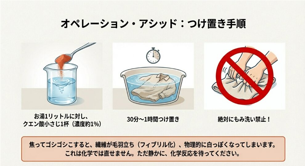 (純度の高いクエン酸が、繊維の奥に固着した不要な白さを化学的に剥がし取ります)