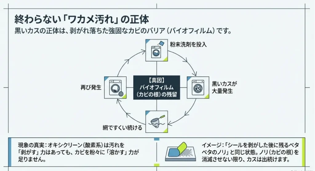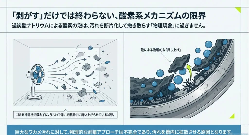 実は、オキシクリーンを使っても黒いカスが止まらないのは、あなたの使い方が悪いわけではありません。それは、酸素の力で汚れを「剥がす」という仕組みそのものに限界があるからなんです。理系ママの視点から言わせてもらえば、今のあなたは「剥がれたカスの大群」を槽内でかき混ぜているだけの状態。この連鎖を断ち切るには、物理で剥がすのをやめて、化学の力で「溶かして消す」戦略への切り替えが必要です。