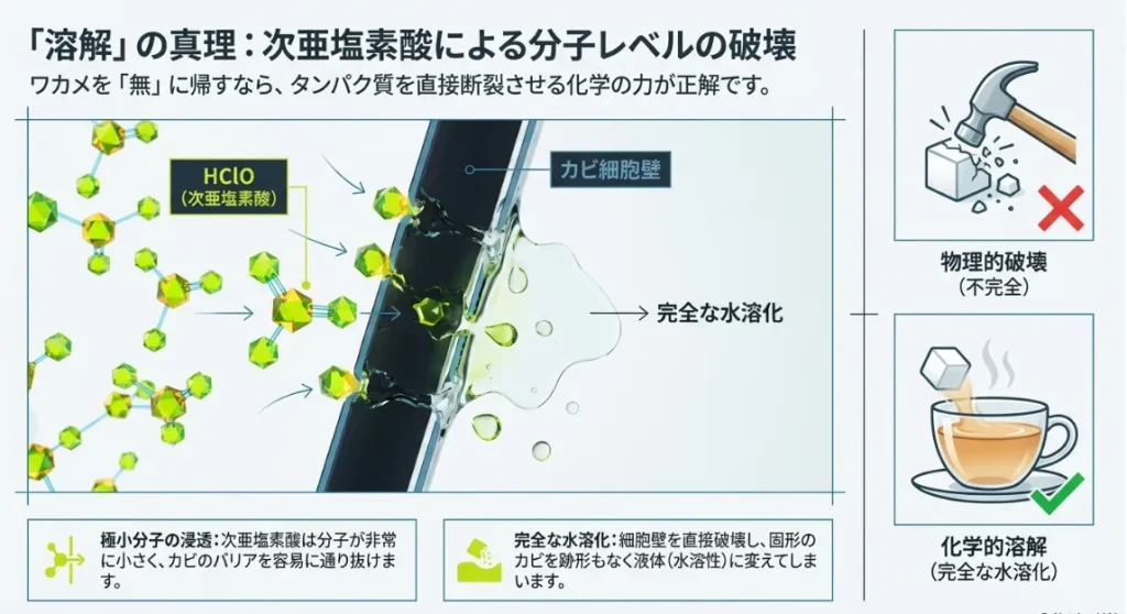 塩素系の主役である「次亜塩素酸」の分子は、非常に小さくて身軽です。カビが作ったネバネバしたシールド(細胞外多糖)のわずかな隙間をスルリと通り抜け、バイオフィルムの奥深くまで浸透します。そして、カビを繋ぎ止めているタンパク質の鎖を、ハサミで切るようにバサバサと切断していくのです。