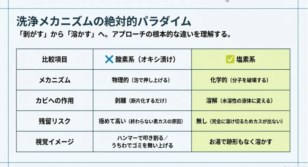 ここで、酸素系(物理的剥離)と塩素系(化学的溶解)の違いを一覧表にまとめました。なぜ「終わらないワカメ」には塩素系が必須なのか、一目でわかります。