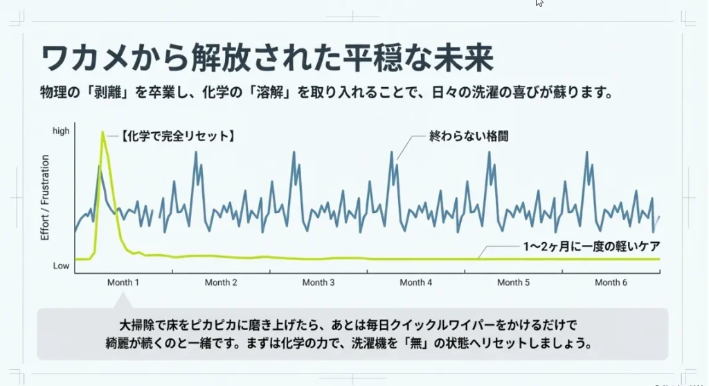 なぜ、どれだけ掃除してもワカメは消えないのか。 それは、酸素系クリーナーがバイオフィルムの「表面」を削っているだけで、核となる構造を破壊できていないからです。 この「無限ループ」を物理的に断ち切るには、塩素系による「溶解」を正しくコントロールする知識が欠かせません。 汚れが生まれるプロセスを科学的に理解し、リセットから予防までを一気通貫で完結させる「溶解戦略」のすべてをここにまとめました。 もう、網を持って洗濯機の前に立ち尽くす日々とはサヨナラしましょう。