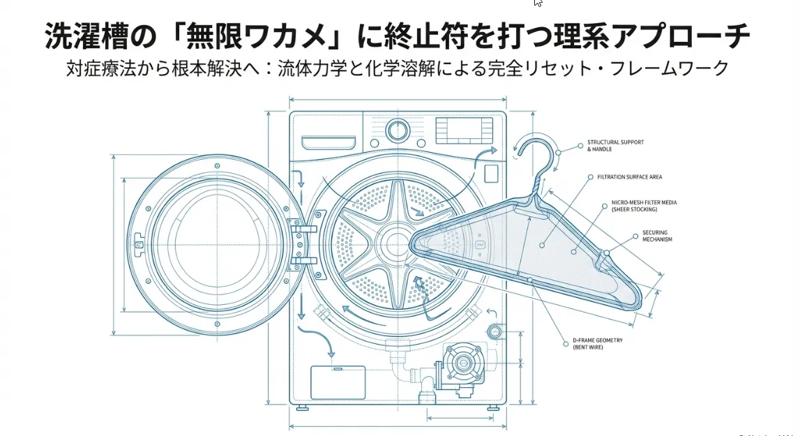 洗濯槽のワカメは、見た目の不快感だけでなく、大切な衣類を汚してしまう困りもの。でも、ハンガーとストッキングで作る「物理フィルター」があれば、急場はしのげます。そして、その先の「溶解戦略」を知っていれば、もうワカメを恐れる必要はありません。