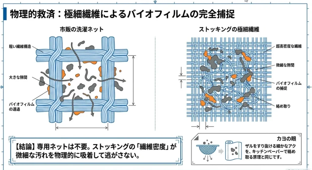 市販のゴミ取りネットは、網目が比較的粗い「点」で汚れを引っ掛ける構造です。一方、ストッキングを構成するナイロンなどの極細繊維は、一本一本が複雑に重なり合った三次元の網目構造を作っています。この繊維の細さが、水の抵抗を最小限に抑えつつ、バイオフィルム(ワカメの正体)特有のヌメリ成分をキャッチする「吸着力」を生み出すのです。
