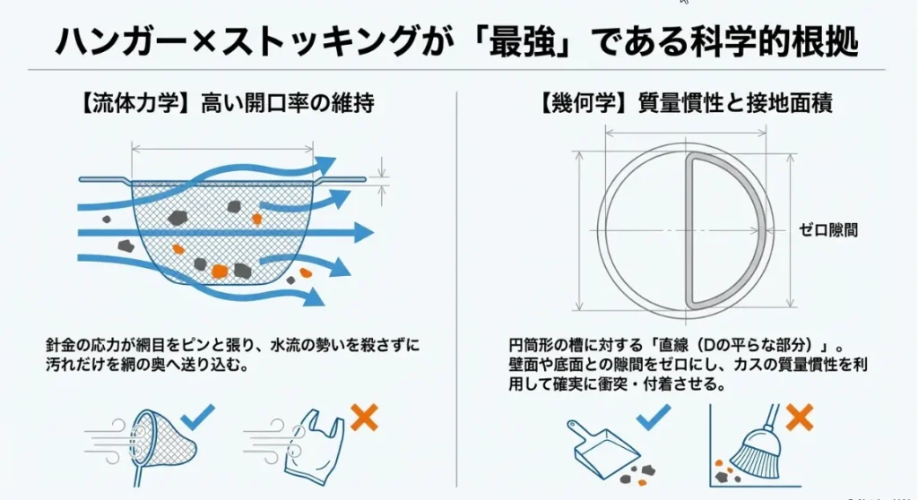 洗濯槽の中は激しい水の流れ(乱流)が発生しています。ここで重要なのが、フレームの「しなり(弾性応力)」です。プラスチック製の弱いフレームだと水圧に負けて網口が閉じてしまいますが、スチール製の針金ハンガーは適度な反発力で網目をピンと広げ続けてくれます。この絶妙な張力が、水流を殺さずにカスだけを効率よく網の奥へと送り込んでくれるんですよ。