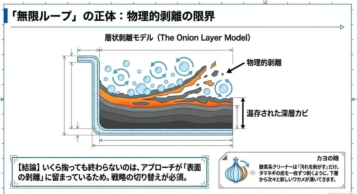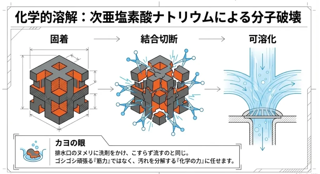 「もう1時間も掬い続けているのに、まだワカメが出てくる…」と絶望しているあなた。それはあなたのやり方が悪いのではなく、使っている薬剤の「仕組み」に理由があります。今あなたが使っている酸素系漂白剤は、汚れを「剥がす」力はあっても、「溶かす」力はほとんど持っていないのです。