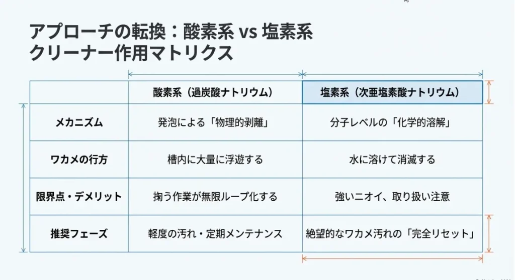 代用ネットで「今ある汚れ」をすくい取ったら、次は「終わらないワカメ」の元を断ち切りましょう。実は、いくらすくっても切りがないのは、洗濯槽の裏側にまだ剥がれきっていない巨大な汚れの層が残っているからです。これを物理的に剥がす(酸素系)のではなく、化学の力で「溶かして消す(塩素系)」のが、家事の時間を劇的に減らすプロの知恵なんです。