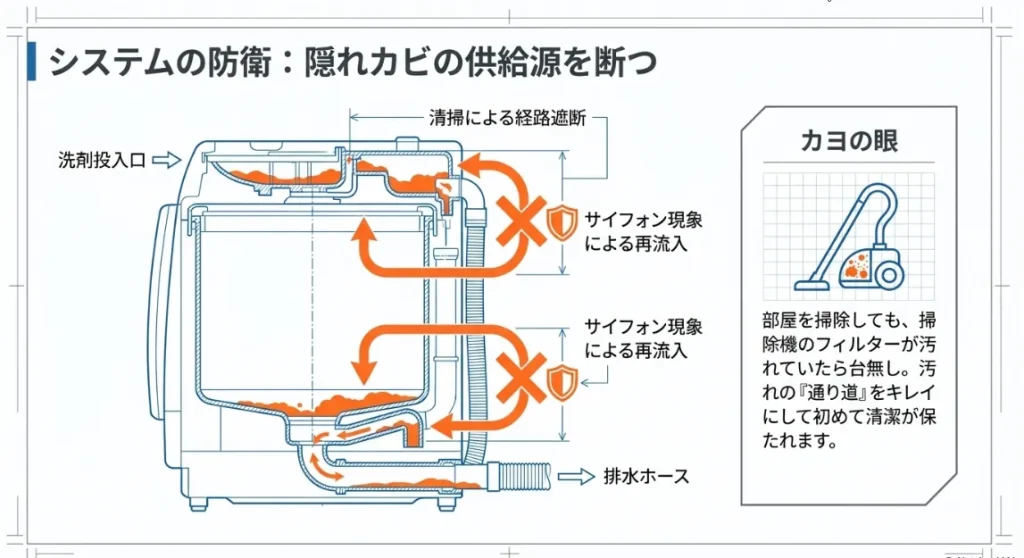 ホースの逆流を防ぎ、洗剤投入口の「隠れカビ」を叩く方法