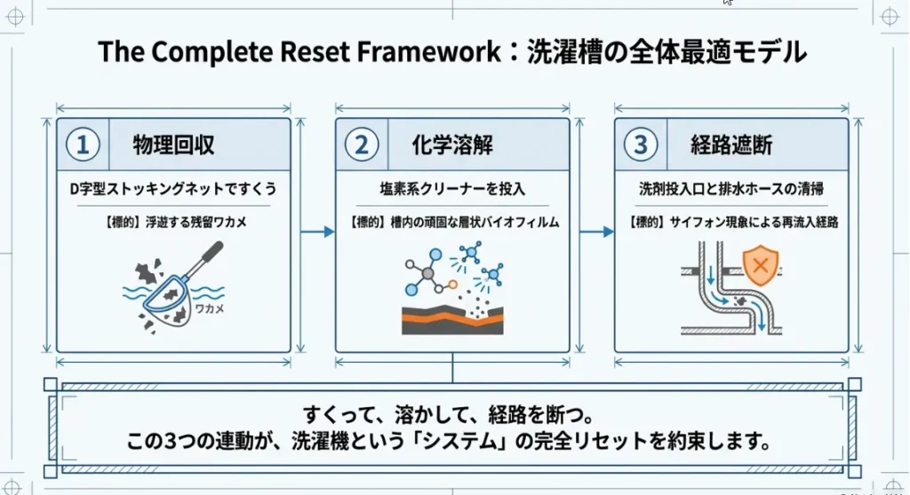 代用ネットで今ある汚れを捕まえたら、次は「汚れをゼロにする」フェーズです。掃除してもワカメが止まらない本当の理由は、洗濯槽の裏に潜む「バイオフィルム」にあります。これを分子レベルで溶かして消し去る、理系ママ流の「科学的リセット術」を公開中。この理論さえマスターすれば、来年以降の掃除はスイッチ一つで完結するようになります。
