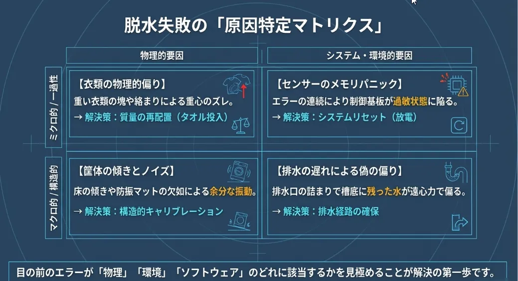 私も昔、急いでいる時にこのループにハマって「もう!何やってるの!」と洗濯機を叩きたくなったことがあります(笑)。でも、理屈がわかればセンサーは頼もしい味方。機械とケンカするより、物理的にバランスを整えてあげるのが完遂への近道です!