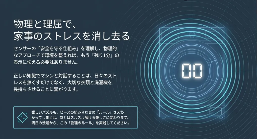 実はこれ、洗濯機が故障しているわけではないんです。1分という表示の裏側で、洗濯機の中にある「センサー」が必死にあなたと衣類を守ろうと戦っている証拠。理系ママの視点から言わせてもらうと、この現象は「物理の法則」をちょっとだけ味方につけるだけで、驚くほどあっさりと解決できます。