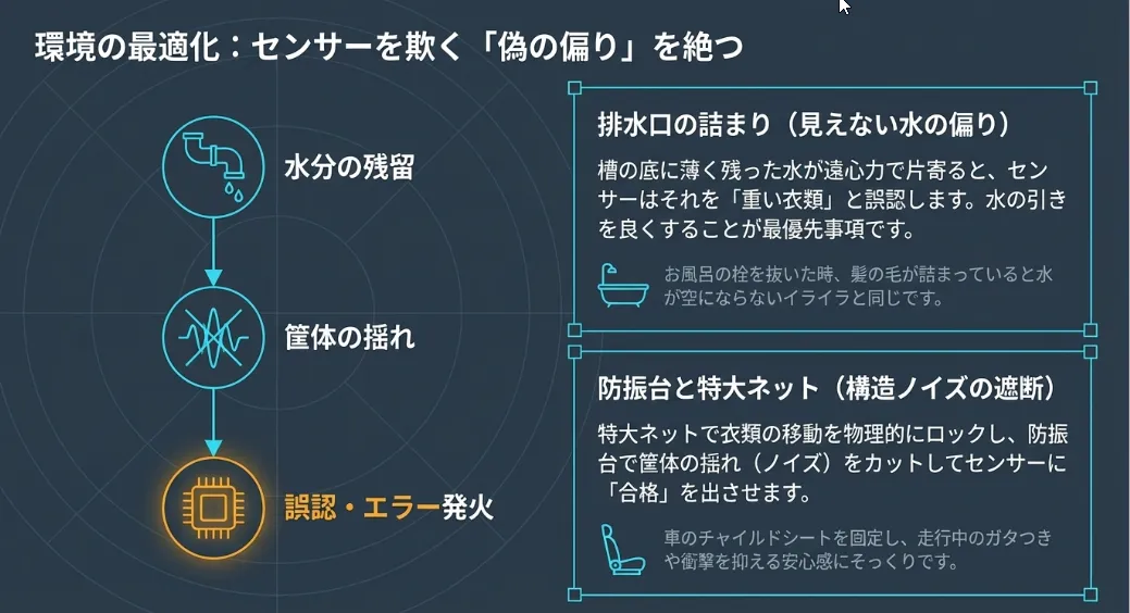 衣類の膨らみや水の残りといった「見えない重さ」をコントロールするのがコツ。便利なネットや設置台を賢く使って、センサーに「合格」を出してもらいましょう。