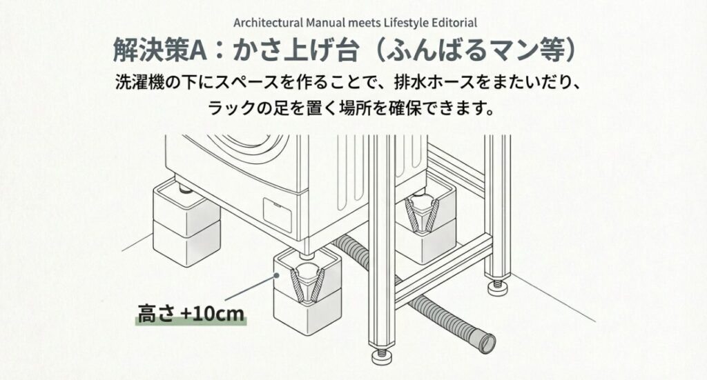 「どうしてもラックの脚を置く場所がない!」という状況を打破する最強のツールが、洗濯機の下に設置する「かさ上げ台」です。有名なのは「ふんばるマン」などの製品ですね。これを洗濯機の4隅の脚の下に置くだけで、洗濯機本体が約5cm〜10cmほど持ち上がります。これによって生まれる「わずかな隙間」が、実は多くの問題を解決してくれるんです。