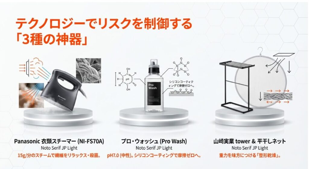 「水洗い不可」というマークに怯える必要はありません。最新のテクノロジー(NI-FS70A)で汚れを叩き出し、化学の盾(プロ・ウォッシュ)で繊維を守り、物理的なコントロール(tower 10266)で形を整える。これが揃えば、家庭での洗濯は「精密なメンテナンス」へと昇華します。