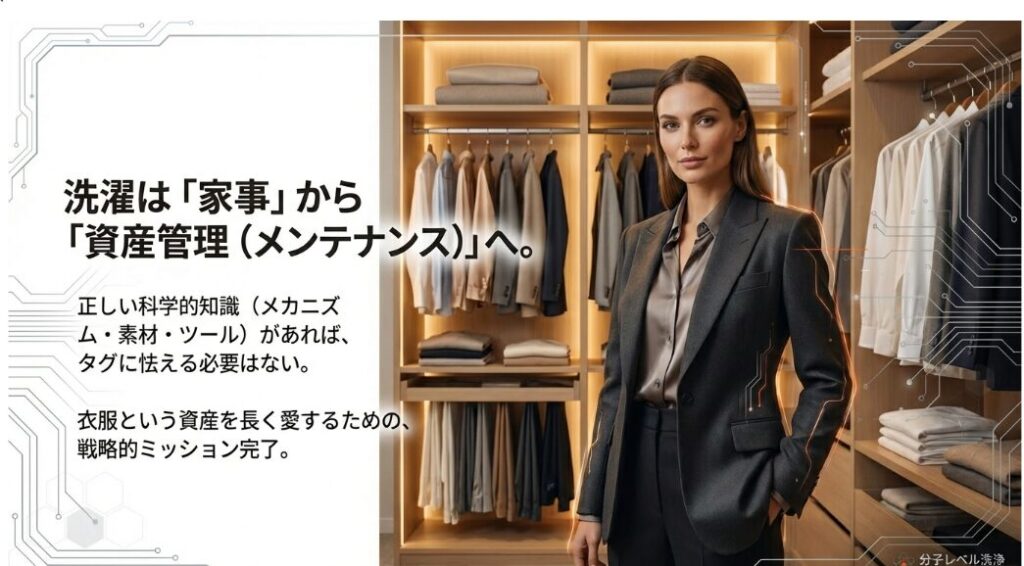 服の価値は、ブランド名ではなく、どれだけ正しく「管理(ロジック)」されているかで決まります。正しい道具と知識は、あなたの記憶が詰まった一着を守る最強の装備です。