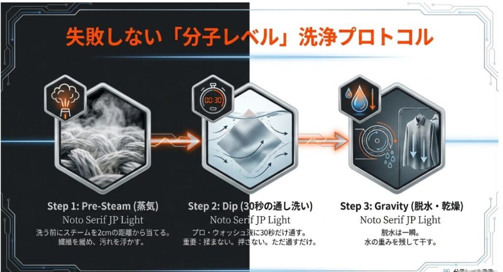 - 【ロジック:高純度シリコン】 汚れを剥がすと同時に繊維表面を瞬時にラッピング。水分子の侵入(膨潤)を物理的に遅らせ、「縮み」の隙を与えません。
