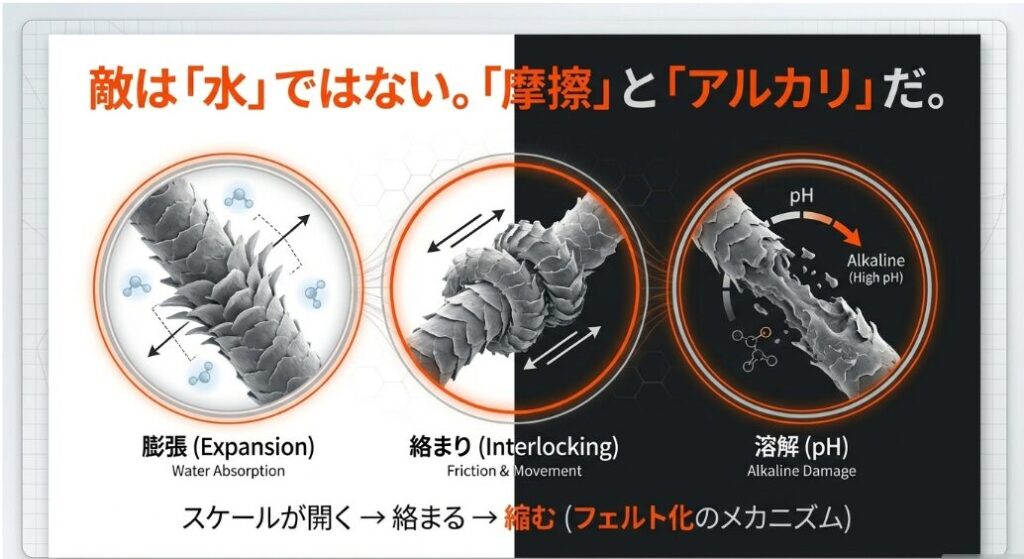 ウールやカシミヤなどの獣毛には、表面に「スケール(うろこ)」という突起が存在します。これらは水に濡れると開き、洗濯機の回転という物理的な振動が加わることで、スケール同士がマジックテープのようにガチガチに絡み合います。これを「フェルト化」と呼びますが、一度絡まったうろこを解くのは、物理的にほぼ不可能です。メーカーが「×」をつける最大の理由は、この『縮みの不可逆性』にあります。