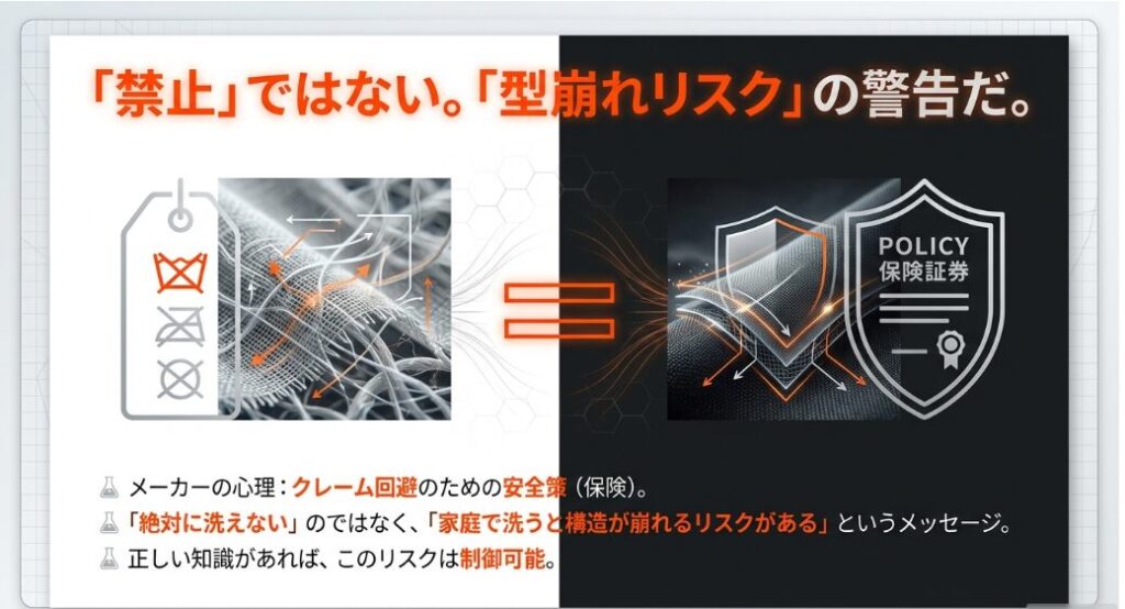 こんにちは、理系ママのカヨです。多くの人がこの「水洗い不可(家庭洗濯禁止)」マークを、法律のような絶対的な命令だと思い込んでいます。しかし、化学と物理の視点から見れば、このマークは単なるリスク回避の「警告」に過ぎません。メーカー側が「万が一、水という溶媒によって服が数ミリ縮んだり、風合いが変わったりしても、うちは責任を持ちませんよ」という防衛線を張っているだけなのです。