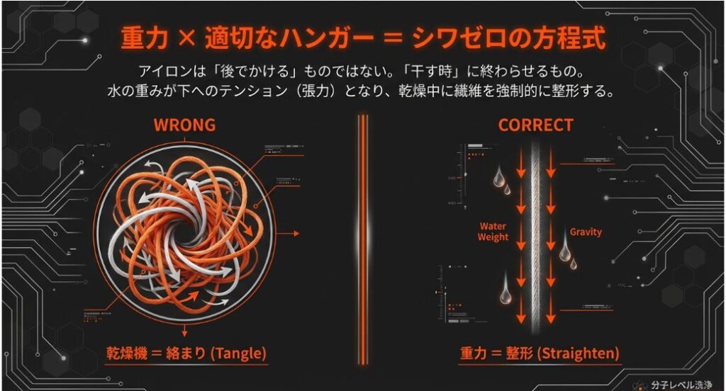 - 【数値:高さ142cmの垂直重力】 ロングコートが裾をつかずに吊るせるこの高さは、水の重みを「垂直方向のテンション」として利用し、アイロンなしでシワを引き伸ばすための数値です。