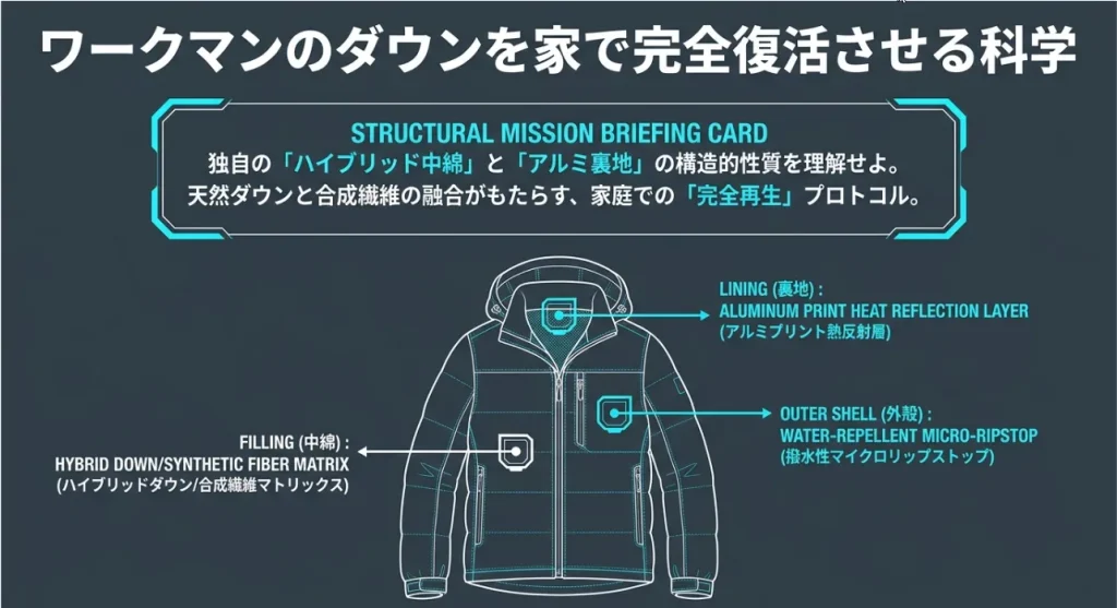 ワークマン独自のアルミプリントによる脱水エラーを物理的に回避し、熱の力で寝てしまった繊維と撥水成分を分子レベルで整列させることが、復活の最短ルートです。
