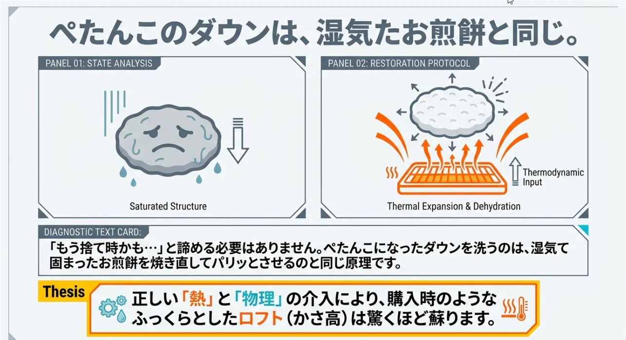 失敗して「ぺちゃんこ」になったダウンを、家庭でふっくら蘇らせる全技術を公開しています。