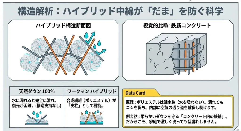 天然ダウン100%だと、水に濡れた瞬間にすべてが塊になってしまいますが、合成繊維は水を含んでも形が崩れにくい「疎水性(水を嫌う性質)」を持っています。この合成繊維が中綿の中で「支柱(ストラット)」の役割を果たし、乾燥した時に空気の通り道をしっかり確保してくれるんです。だからこそ、ワークマンのダウンは家庭でもダマになりにくく、効率的に乾かすことができるんですよ。