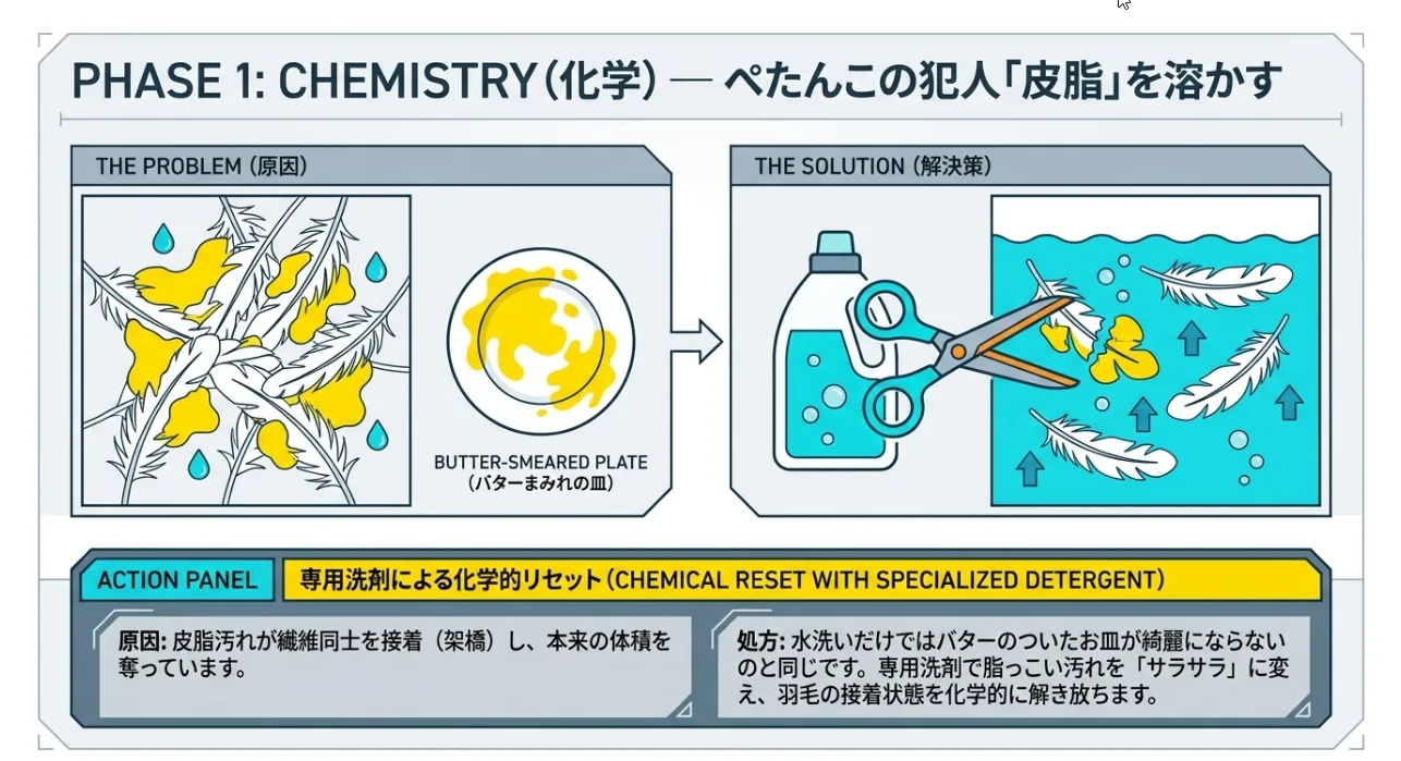 ペタンコの原因「皮脂」を化学で溶かして羽毛を解放します