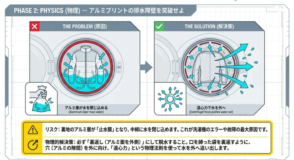 裏地に施されたアルミプリントは、水の通りを物理的に塞いでしまいます。洗濯槽が高速回転しても、水が外に逃げられず、衣類の中に溜まった水の重みで洗濯機が暴れてしまうんですね。これを無理に回そうとすると故障の原因にもなりかねないので、物理的なアプローチが必要になります。