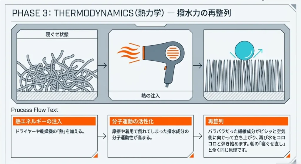 生地の表面には、水を弾くための微細なトゲのような「撥水基」が並んでいます。これが摩擦や汚れで倒れてしまうと、水滴を支えられなくなり、生地に水が染み込んでしまいます。でも、これに「熱」というエネルギーを与えてあげると、トゲが再びシャキッと立ち上がる「自己配向」という現象が起きるんです。まるで寝ぐせをお湯とドライヤーで直すようなもの。この熱の使いこなしこそが、復活の決め手です。