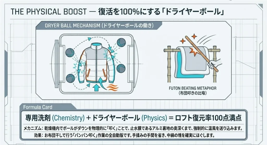 ワークマンのフュージョンダウンをフカフカに戻すなら、乾燥機が最強の味方です。ここで重要なのが、アルミプリント層のせいで中に閉じ込められた水分を「物理的に叩き出す」こと。そのために必要なのが、乾燥機用のボールです。